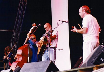 Following his extraordinary success on the Fairport Tour in January 1991, Jay played Cropredy Festival, Fairport's huge summer festival (25,000 people in a massive natural auditorium!) that year, playing enthusiastically-received solo spots & also the prestigious Saturday afternoon slot in band mode with Chris Leslie (fiddle, far left), Bernard O'Neill (double bass next to Jay) & Paul Richards (percussion & whistle, right).